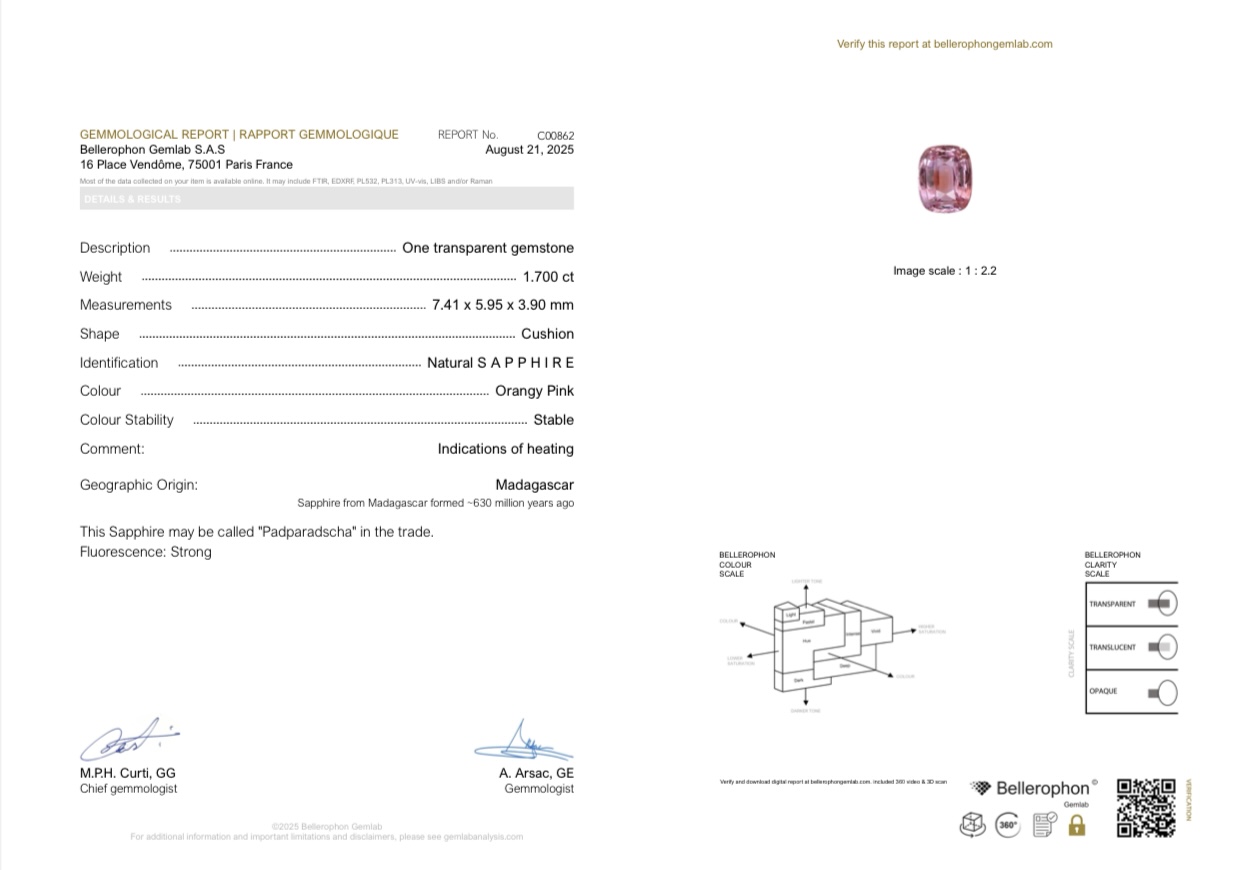 A beautiful 1.70 carat Cushion Padparadscha Sapphire. Its delicate blend of pink and orange hues, paired with a radiant glow, makes it perfect for refined fine‑jewelry creations.