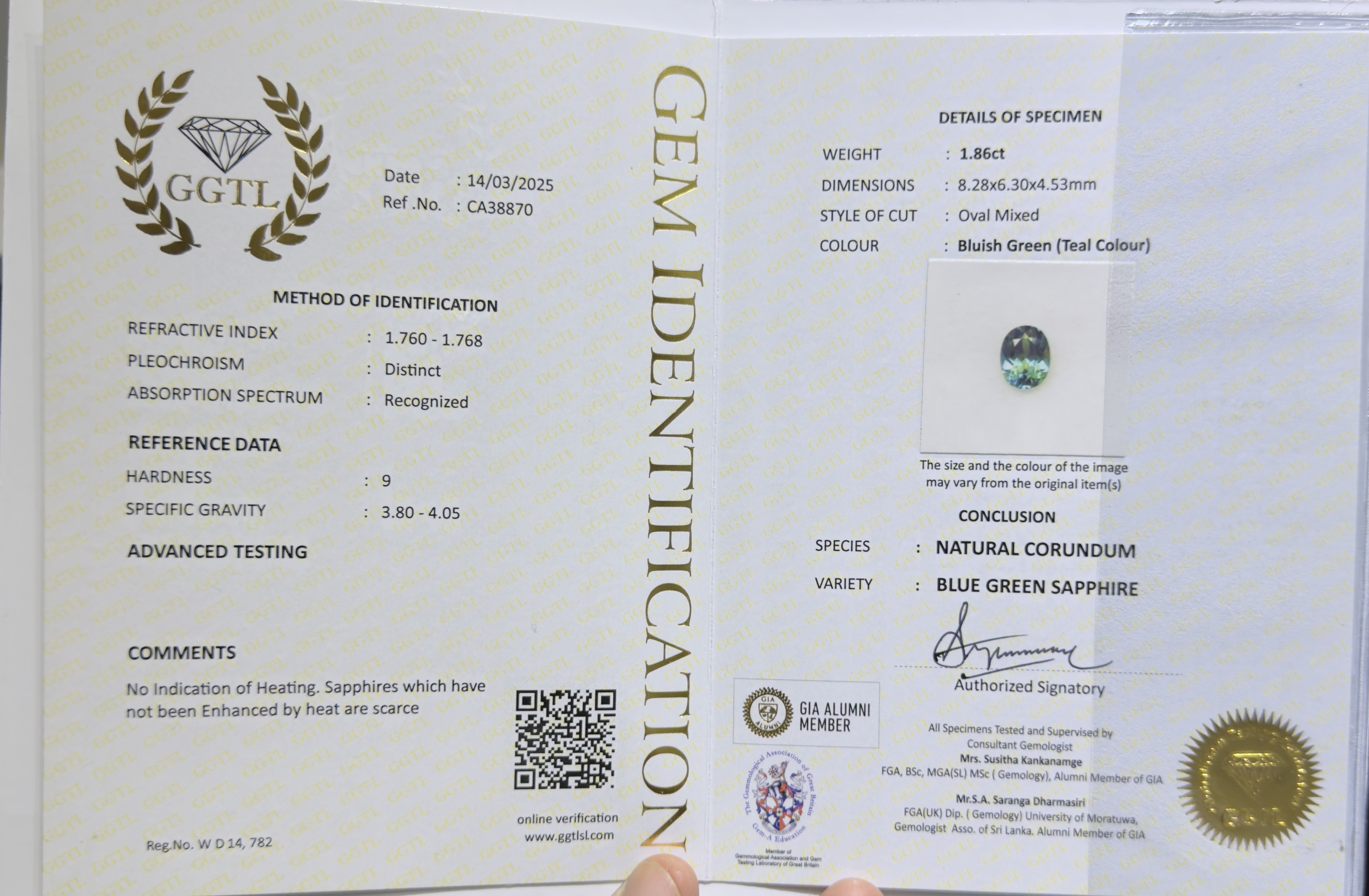 Oval 1.80 Ct UNHEATED Teal Green Sapphire, unheated. Its unique blend of blue‑green tones and brilliant sparkle makes it perfect for distinctive fine‑jewelry creations.