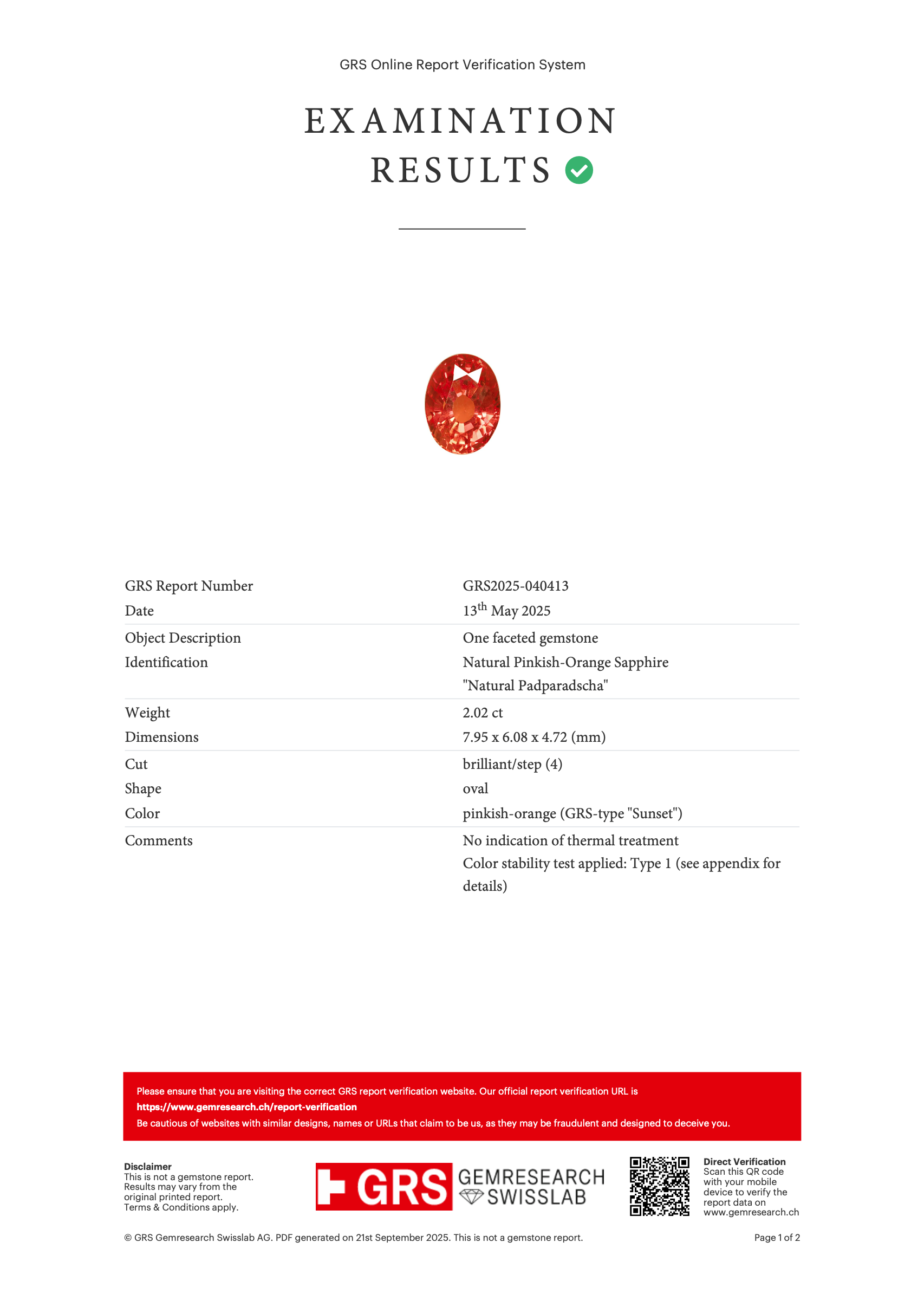 A rare 2.02 carat Oval Padparadscha Sapphire, unheated. Its exquisite Vivid orangish-pink hue and natural brilliance make it a perfect gem for refined and timeless fine‑jewelry creations.