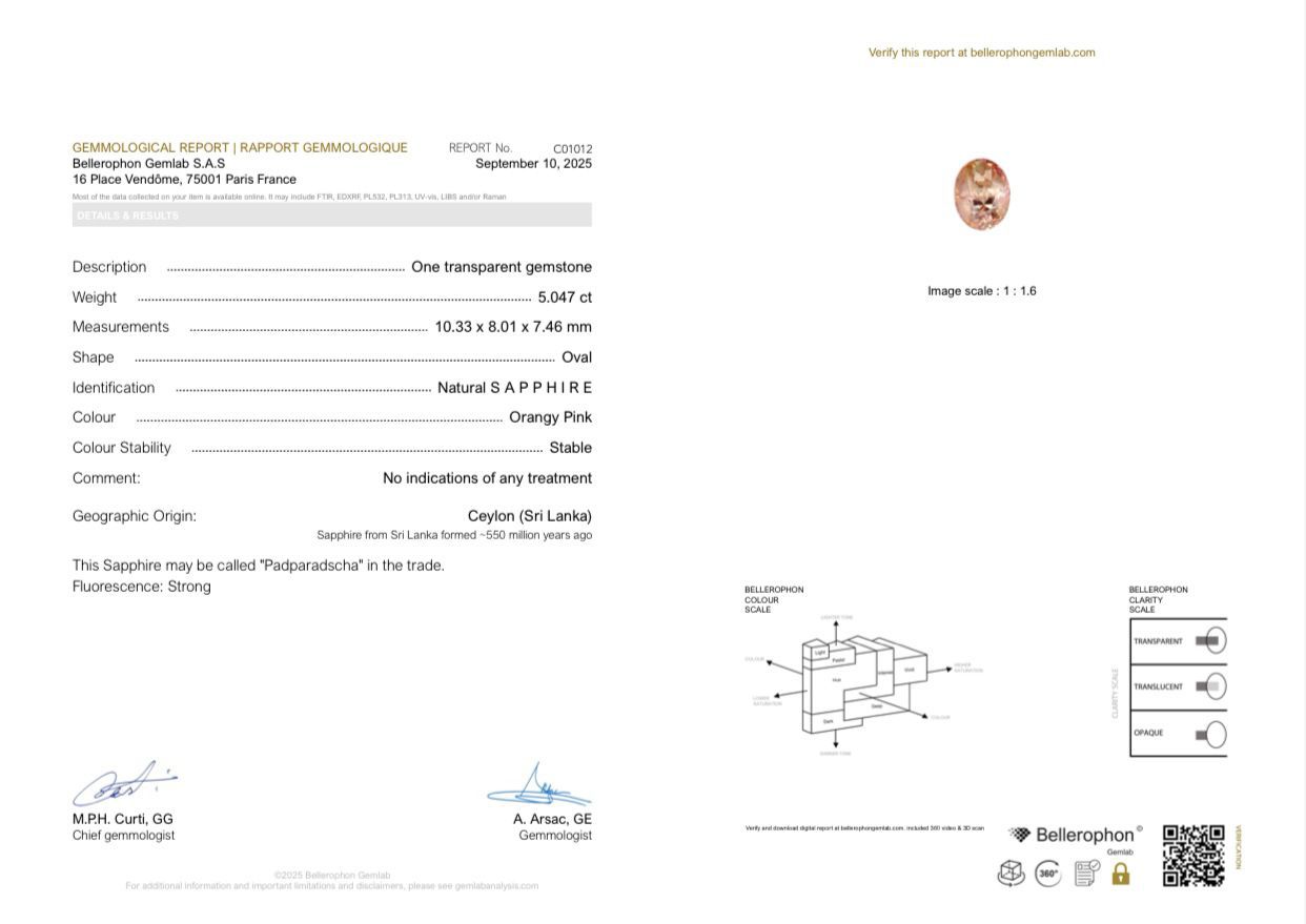 A rare 5.00 carat Oval Padparadscha Sapphire, unheated and of Sri Lankan origin. Its enchanting pinkish‑orange hue and exceptional sparkle make it perfect for extraordinary fine‑jewelry creations. Stable Color