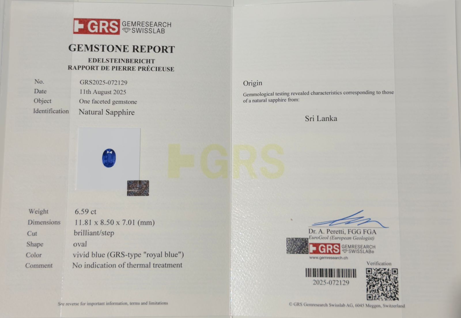 A magnificent 6.59 carat Oval Royal Blue Sapphire, unheated and of Sri Lankan origin. Its rich royal blue hue and brilliant clarity make it a true statement gem for timeless fine‑jewelry creations.